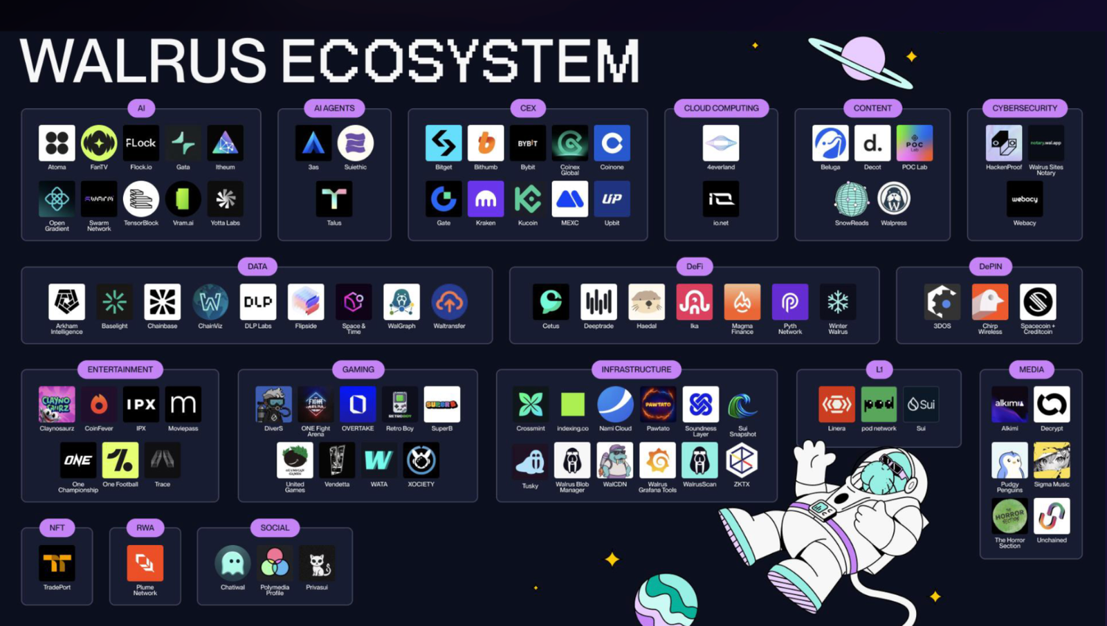 - CUDIS: Cudius là một protocol về tuổi thọ con người, kết hợp công nghệ thiết bị đeo và AI, sẽ hợp tác với Walrus. CUDIS sử dụng Walrus để trao quyền sở hữu dữ liệu sức khỏe cho người dùng, cho phép họ bán dữ liệu của mình để huấn luyện mô hình AI mới.
