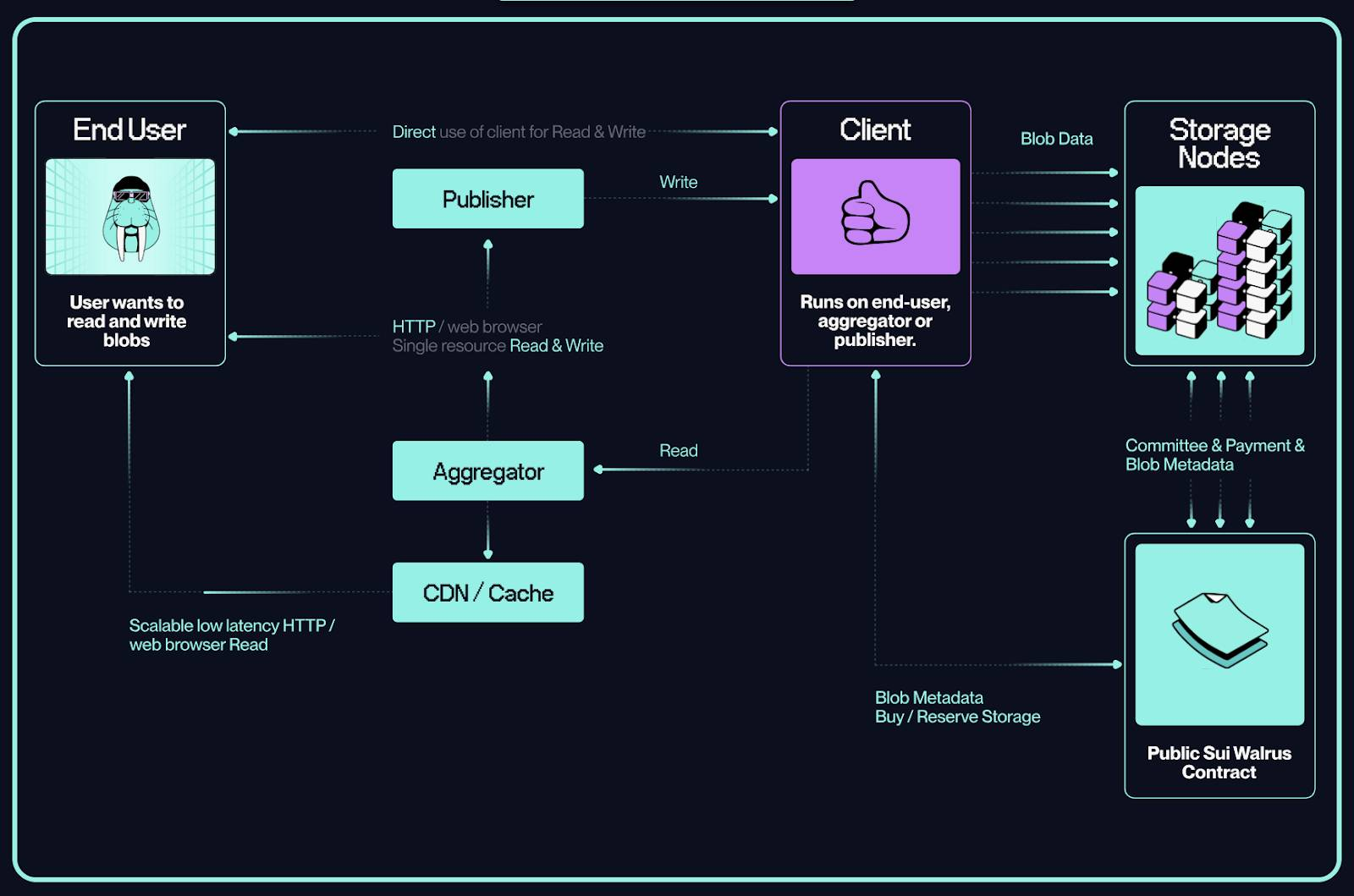 Walrus hoạt động như một hệ thống lưu trữ phi tập trung, cho phép các nhà phát triển, người dùng lưu trữ và truy cập dữ liệu an toàn trên blockchain. Dưới đây là cách hệ thống này hoạt động: