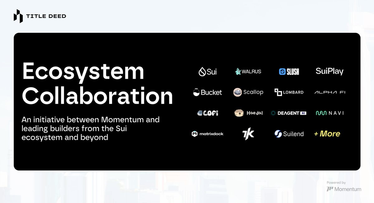 Chương trình giveaway Deed NFT của Momentum được hỗ trợ bởi những builder hàng đầu trong hệ sinh thái Sui, bao gồm: Sui, Slush Wallet, Walrus, Suiplay, Alphafi, LOFI, MatrixDock, Navi, Suilend, Scallop, 7k, Bucket, Overtake, DeAgent AI và nhiều đối tác khác.