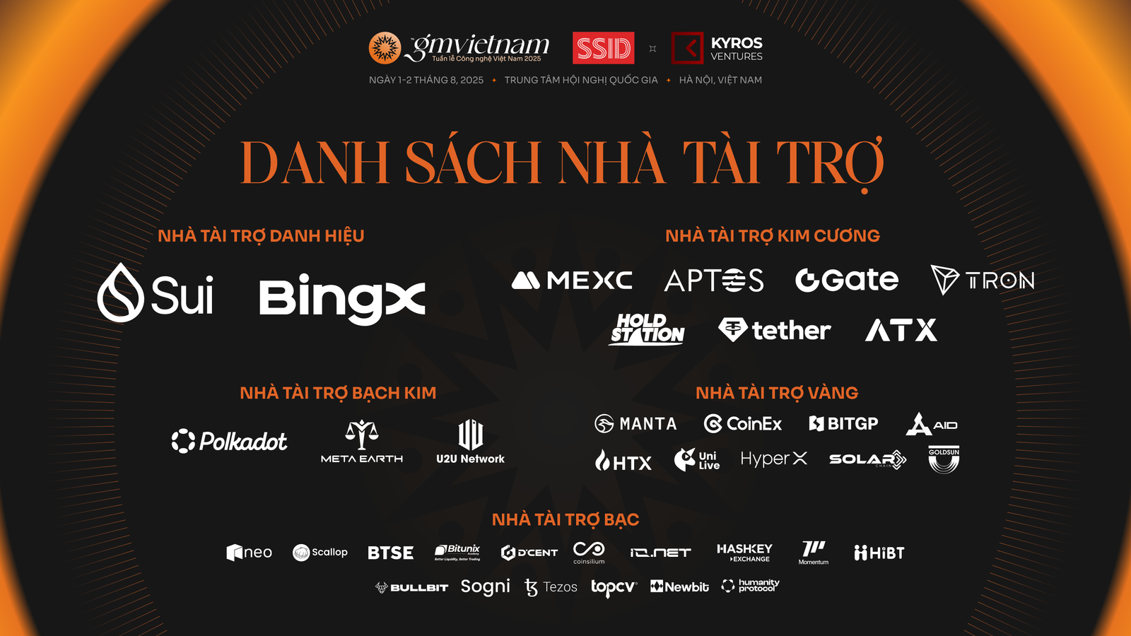 Ngoài ra, không thể không nhắc đến sự đồng hành của 37 đơn vị tài trợ bao gồm Sui, BingX, MEXC, Aptos, Gate, TRON, Holdstation, Tether, ATX, Polkadot, Meta Earth, U2U Network, Manta Network, CoinEx, BITGP, AID, HTX, UniLive, HyperX, Solar Chain, Goldsun Media, NEO, Scallop, BTSE, Bitunix, D’CENT, Coinsilium, io.net, HashKey Exchange, Momentum, HiBT, Bullbit, Sogni, Tezos, TopCV, NewBit, Humanity Protocol.