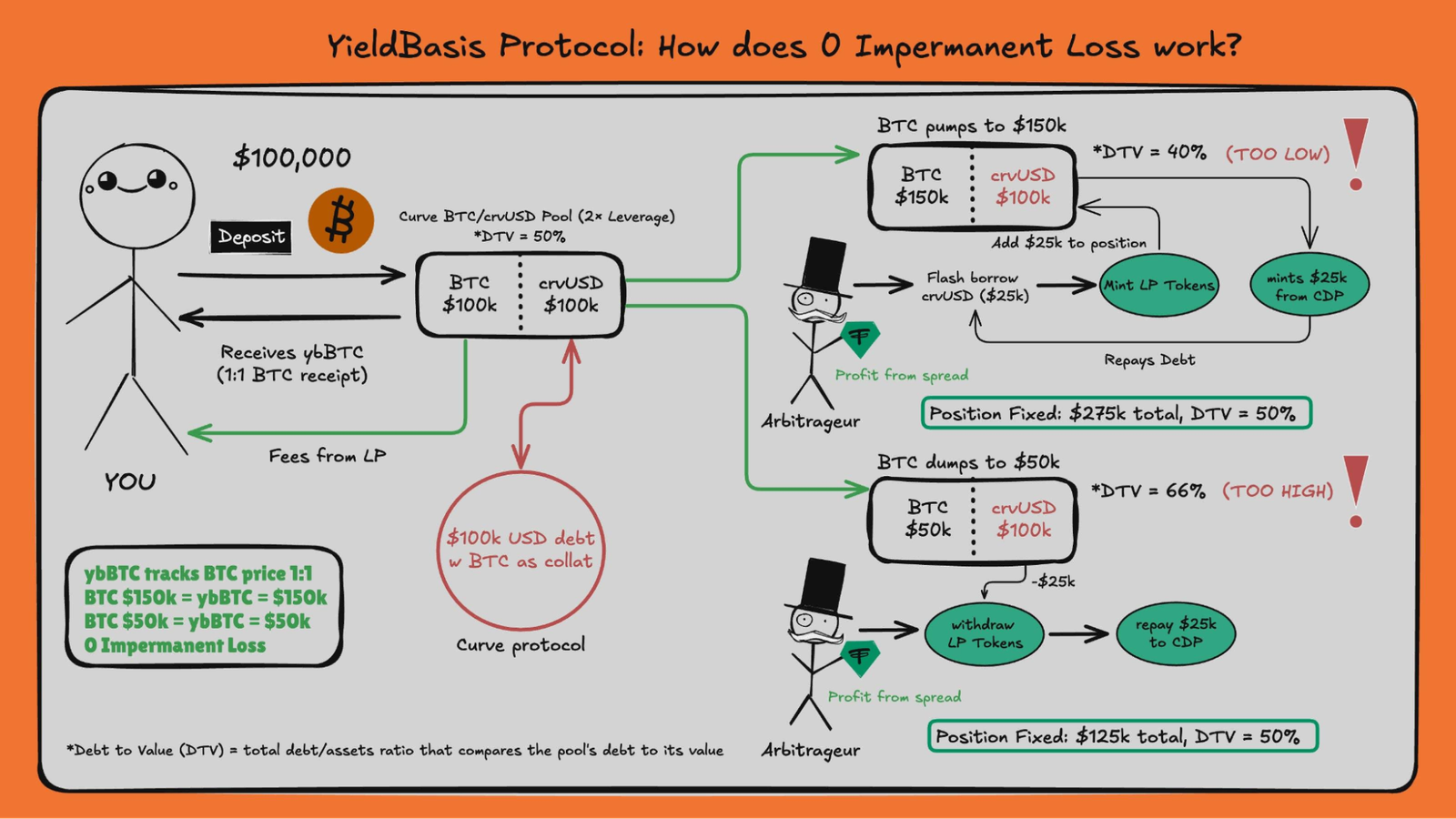 Người dùng gửi BTC vào YieldBasis và nhận ybBTC, token đại diện cho quyền sở hữu vị thế trong pool thanh khoản BTC/crvUSD có đòn bẩy 2x.